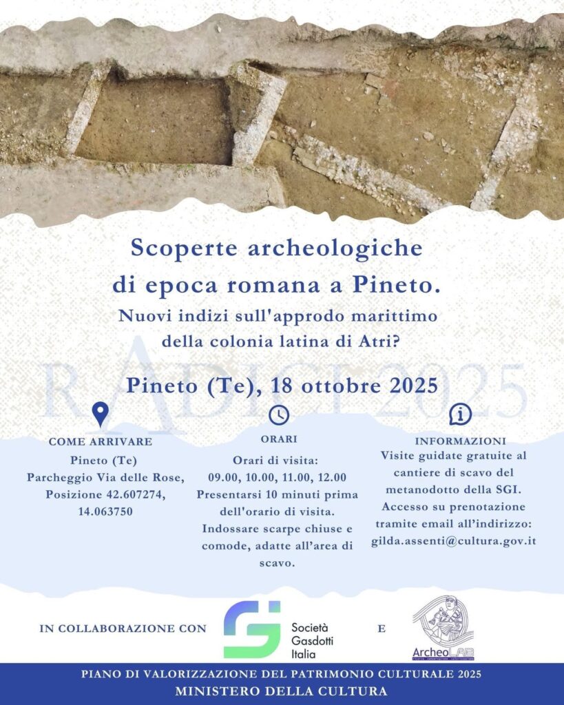 Durante i recenti lavori di metanizzazione sono riemerse fondamenta di edifici e reperti archeologici che raccontano una storia antica, risalente all’epoca romana. Gli scavi hanno portato alla luce fondamenta riconducibili a impianti produttivi e di immagazzinamento merci, un probabile edificio di circa 100 metri quadrati articolati in ambienti funzionali, un’area forno o figlina, e frammenti di anfore del tipo Lamboglia 2 utilizzate per il trasporto di vino e olio. I frammenti ceramici e di terracotta, trovati anche come riempimento delle fondamenta, confermano un’intensa produzione locale e fanno pensare all’esistenza di un impianto per la fabbricazione di anfore e di laterizi, un’attività artigianale di grande importanza economica verosimilmente collegata all’approdo marittimo della colonia latina di Atri.