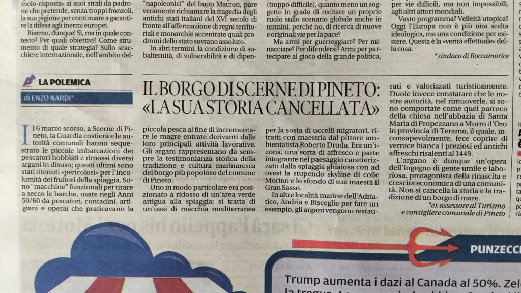Sebbene priva di una grande tradizione marinara, anche sulla costa pinetese si era abituati ad incontrare argani o verricelli nei pressi delle aree di alaggio o della piccola marineria, custodi di anni di pesca e di attività . L’argano è stato sempre visto quale strumento di fatica e di precisione, serviva a tirare a secco le barche dei pescatori e, nel tempo, è diventato simbolo di un mondo del lavoro fondato sull’ingegno,sulla misura e sull’impegno.